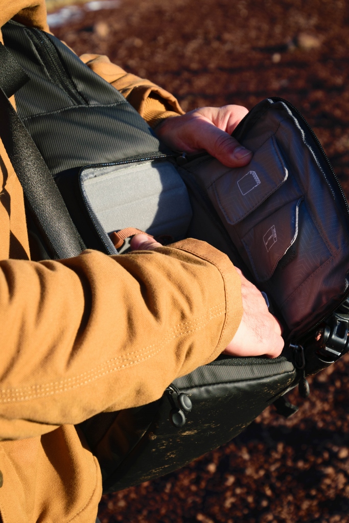 Il a aussi un emplacement prévu pour le trépied et plusieurs petites poches à l’intérieur pour ranger du petit matériel comme des batteries, des câbles ou des cartes SD. Il est agréable à porter mais il pèse tout de même 1.7 kg à vide.