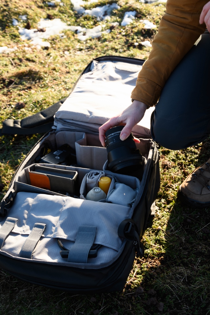 Comme la grande majorité des sacs photos il possède un accès rapide sur le côté au boitier qui permet de le sortir rapidement sans avoir à poser le sac par terre. Il possède un grand compartiment de 10L sur le dessus pour ranger ce que l’on souhaite et un compartiment en bas dédié au matériel photo. Les séparateurs permettent de ranger le tout son matériel comme on le souhaite.