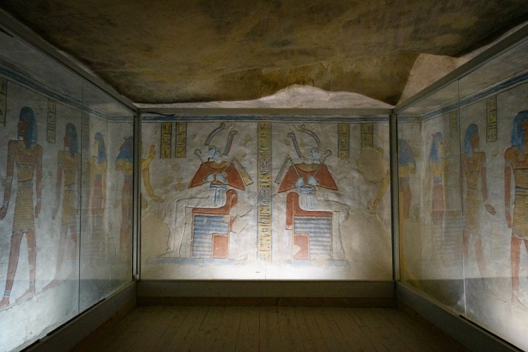 Parmi les petites pépites à découvrir se trouve la tombe de Sennedjem, l’un des plus grands maitres d’œuvre de la nécropole thébaine durant la XIXe dynastie. Un vrai bijou avec des parois richement décorées dont une peinture d’Anubis, le dieu à tête de chacal, préparant la momie. On le retrouve sur de nombreux tombeaux. Dans la réalité, des prêtres formés à cet effet, veillaient à la bonne conservation du cadre et aux rites qui accompagnaient l’embaumement.